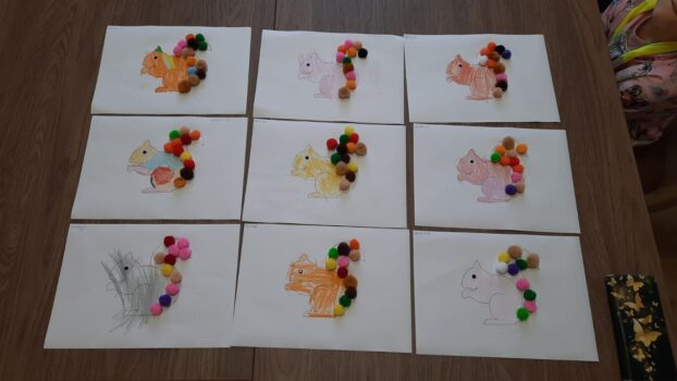 W dalszej części spotkania dzieci miały za zadanie pokolorować wiewiórkę ozdabiając jej kitę kolorowymi pomponami.